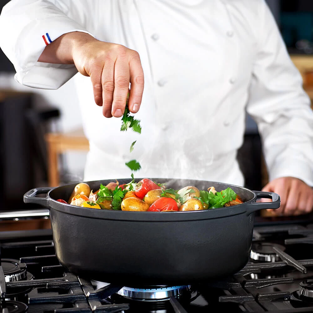 De gietijzeren Oldenhof by Chasseur braadpan is aan de binnen- en buitenzijde voorzien van een duurzame laag email. Deze laag is ondoordringbaar en zorgt ervoor dat de pan geen geuren, smaken en kleuren opneemt. Het gietijzer zorgt voor een gelijkmatige warmteverdeling door de hele pan, ook op laag vuur. De gietijzeren deksel draagt bij aan de warmteverdeling en zorgt zo dat uw braadstuk rondom regelmatig gaart.