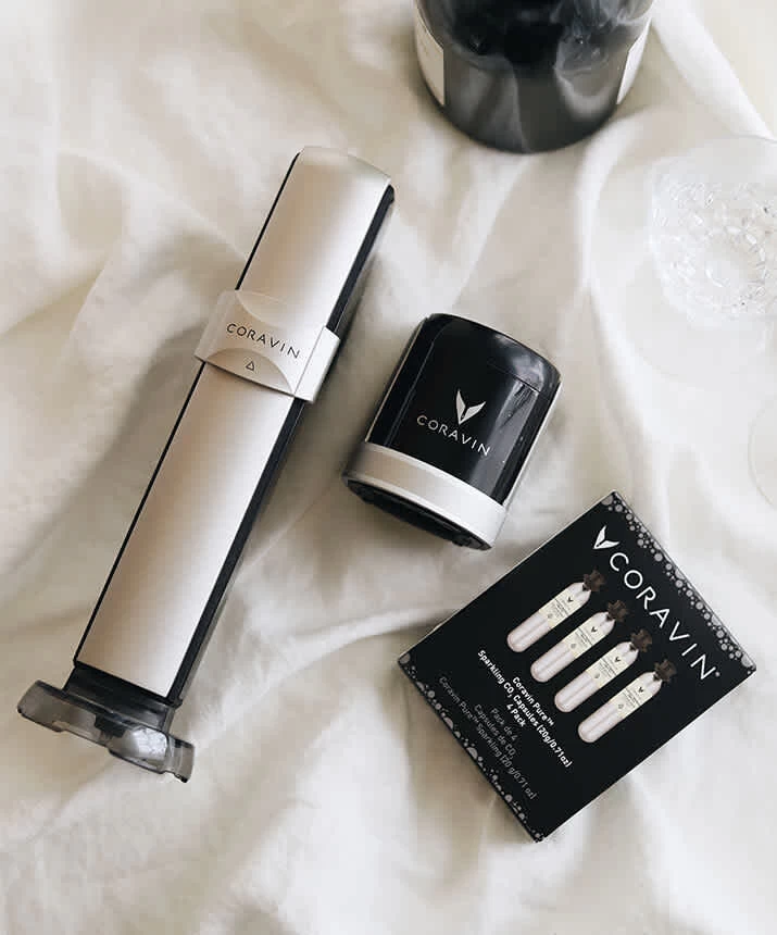 De set wordt geleverd met 4 Coravin Pure Sparkling CO2-capsules, die ervoor zorgen dat de smaak en bubbels van reeds geopende wijnflessen wordt behouden. Elke capsule bewaart tot wel 7 standaardflessen.