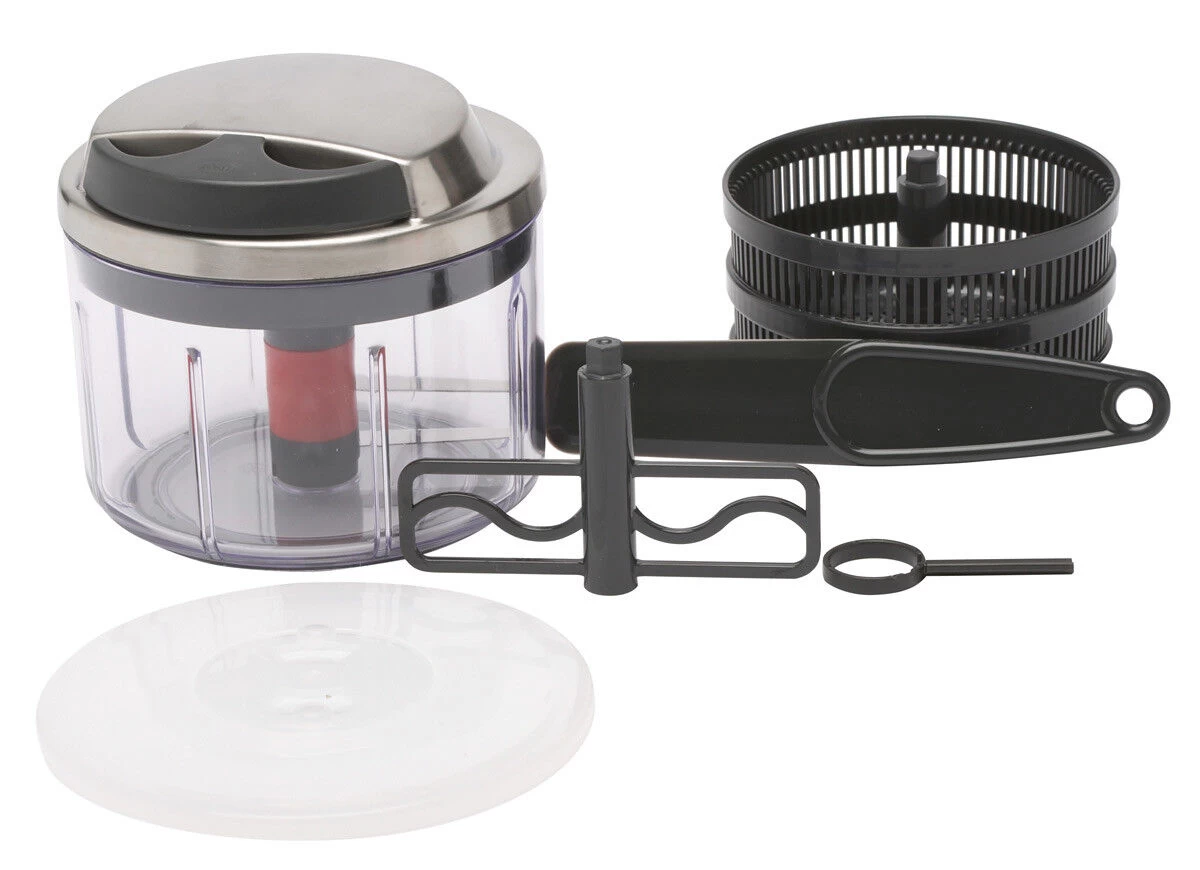 De multisnijder bestaat uit kunstof en roestvrijstalen onderdelen. Het gepatenteerde hakmechanisme van deze snijder heeft twee bewegende messen, waarmee u kruiden, fruit en groenten kunt hakken. De molen wordt aangedreven als een slacentrifuge: door aan de hendel te trekken.