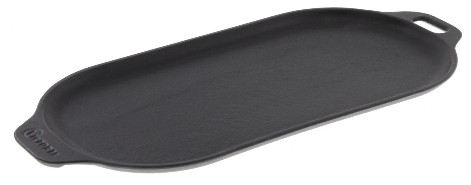 De Victoria serveer-/ bakplaat gemaakt van gietijzer. De plaat is 34 cm lang, 17 cm breed en is voorzien van een kleine opstaande rand. Aan de korte zijden zit een kleine handgreep. Gebruik de plaat voor het garen van bijvoorbeeld een langwerpig brood of pizza’s in de oven.